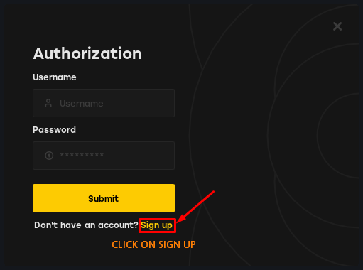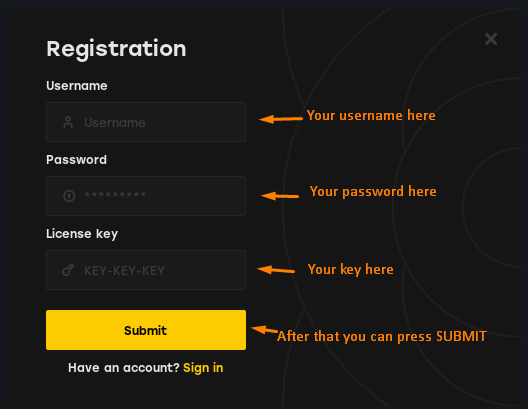 Once in the registration section, enter a username and password that you’ll remember. Then, input the key you received and click on <mark style="color:yellow;">Submit</mark>